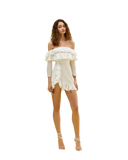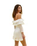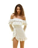 Featuring open shoulders, a defined waistline, and adorned with delightful Japanese braids, it gracefully weaves an unforgettable aesthetic.