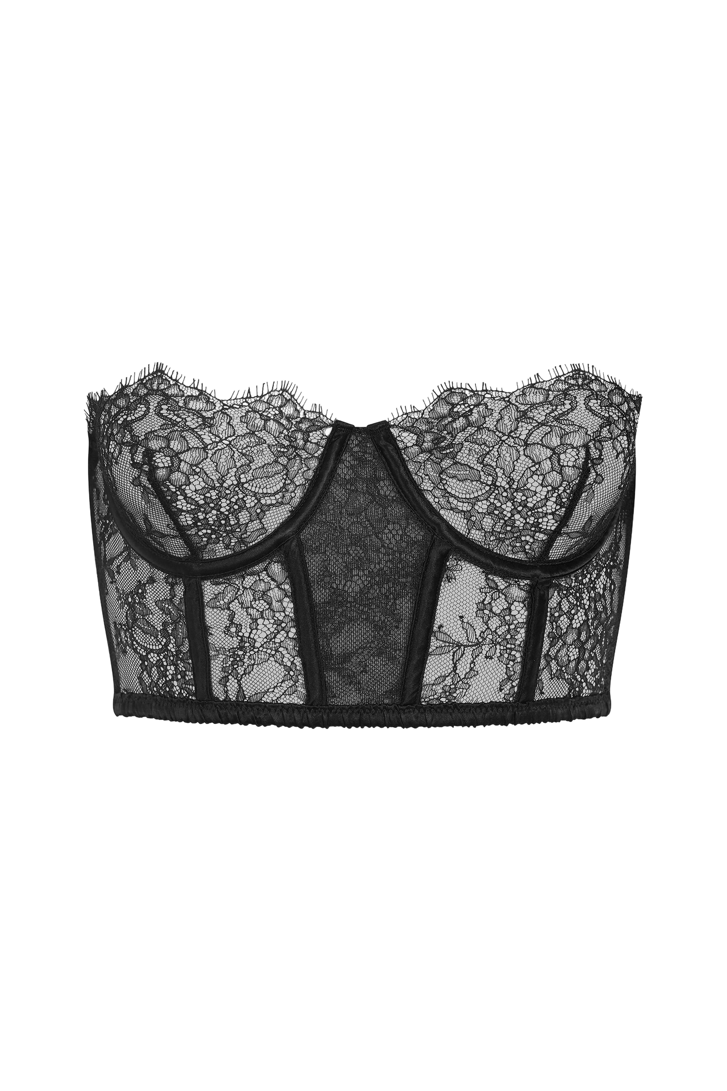 Strapless bra in silk and eyelash lace. Underwired transparent lace cups that perfectly hug and shape the breasts. Front lace enhanced with a fine gathered silk band and a complete contrasting silk back.