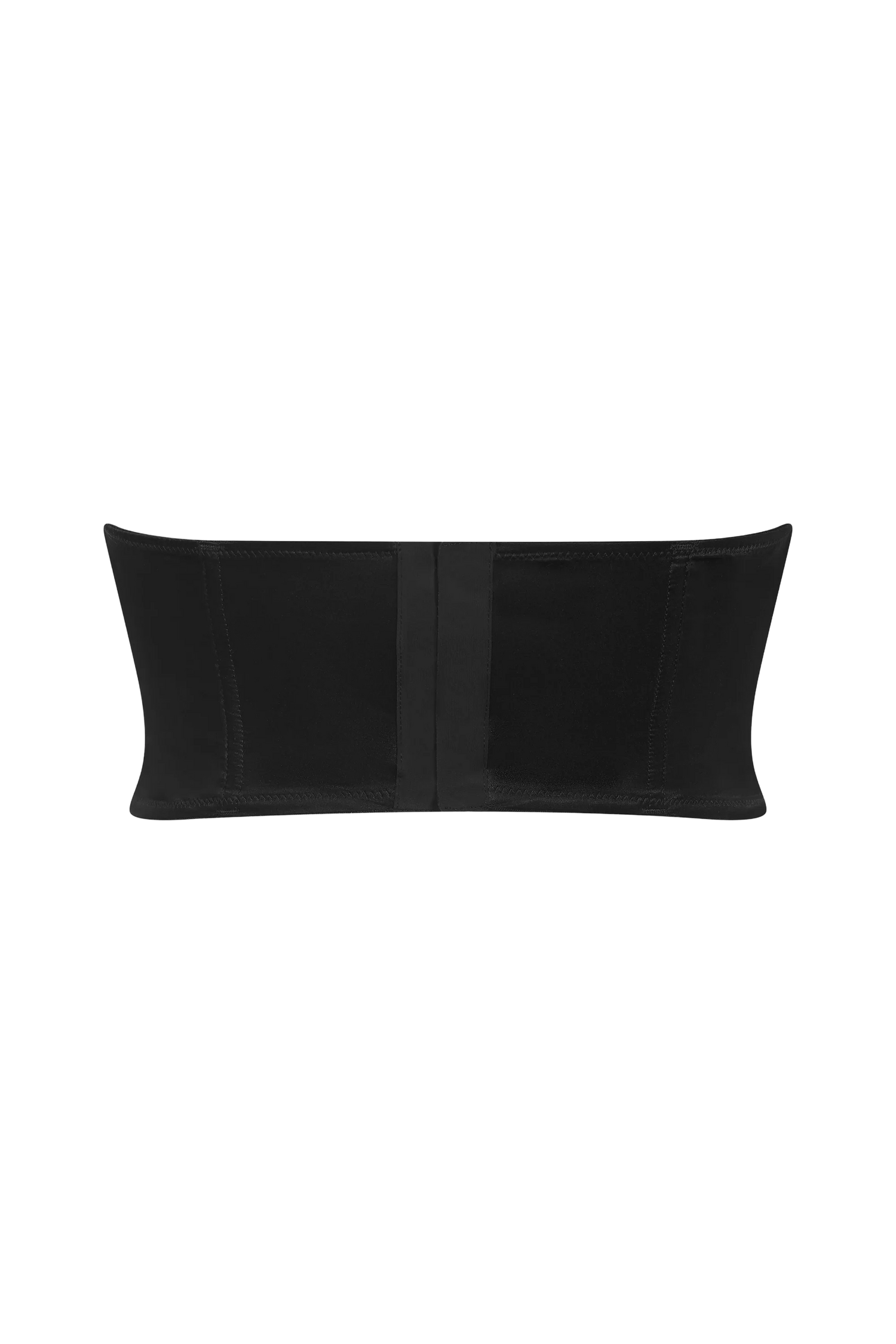Bustier shape with flexible vertical boning in the front and back. Fastens at the back with a adjustable clip.